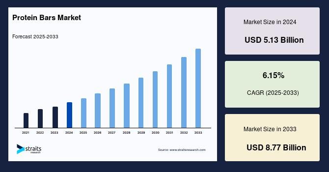 According to StraitsResearch, the global protein bars market size was valued at USD 5.13 billion in 2024 and is estimated to reach USD 8.77 billion by 2033, growing at a CAGR of 6.15% during 2025-2033.