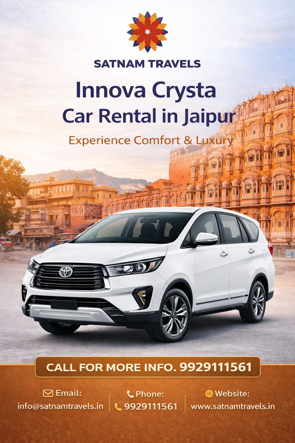 Experience premium travel with Innova Crysta car hire in Jaipur for business trips, airport transfers, and outstation journeys. The Toyota Innova Crysta is known for its luxury feel, safety, and reliable performance, making it a top choice for group travel. Enjoy punctual pickups, professional drivers, and well-maintained vehicles. Satnam Travels delivers trusted rental solutions in Jaipur, ensuring every ride is comfortable, secure, and perfectly suited to your travel plans.
